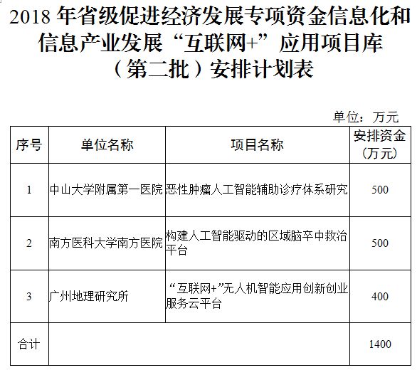 根据《广东省省级工业和信息化专项资金管理办法》(粤财工〔2017〕176号)、《广东省“互联网+”行动计划(2015-2020年)》(粤府办〔2015〕53号)、《广东省加快发展新一代人工智能产业实施方案(2018-2020年)》(粤经信信息函〔2018〕91号)等有关规定,为发挥财政资金引导作用,推进互联网和人工智能新技术应用,促进互联网和人工智能在医疗、教育、物流、创业创新等经济社会各领域深入应用,我委于2018年7月23日印发了《广东省经济和信息化委关于组织申报2018年省级促进经济发展专项资金信息化和信息产业发展“互联网+”应用项目库的通知》(粤经信信息函〔2018〕101号),并组织了专家对申报项目进行评审,根据评审结果拟对2018年省级促进经济发展专项资金信息化和信息产业发展“互联网+”应用项目库(第二批)的资金进行分配。现将资金安排计划予以公示(见附件)。公示期自2018年8月27日至9月1日,共6天。对公示内容如有异议,请在公示期内向省经济和信息化委(信息化推进处)和省财政厅(工贸发展处)反映。以个人名义反映情况的,请提供真实姓名、联系方式和反映事项证明材料等;以单位名义反映情况的,请提供真实单位名称(加盖公章)、联系人、联系方式和反映事项证明材料等。