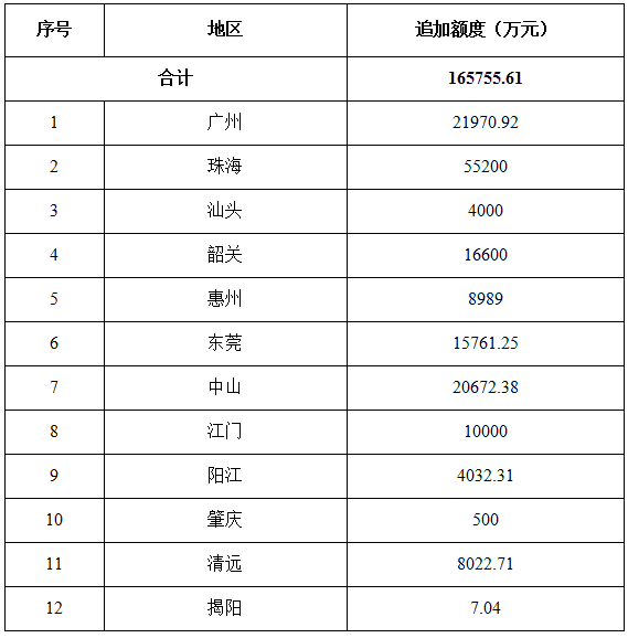 备注:广州市实际资金缺口为58139.54万元,无资金缺口的佛山、河源、梅州、汕尾、湛江、茂名、潮州、云浮8市结余资金中,可用于调剂的资金共36168.62万元。按照省财政厅意见,拟将此36168.62万元全部调剂给广州市(调剂后,广州市的资金追加额度为21970.92万元)。调剂后的资金总追加额度为165755.61万元。