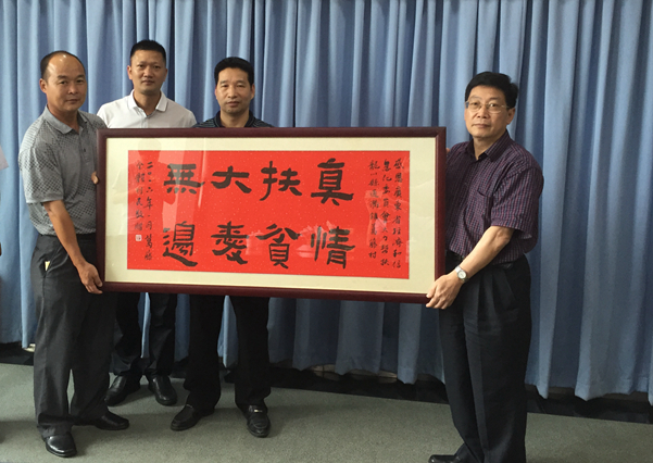 镇、村有关负责人向省经济和信息化委赠送书写“真情扶贫 大爱无边”的牌匾,代表葛藤村全体老百姓,感谢省经济和信息化委第二轮扶贫开发“双到”工作期间对葛藤村的大力帮扶、真情扶贫,曾健代表省经济和信息化委接收了牌匾。
