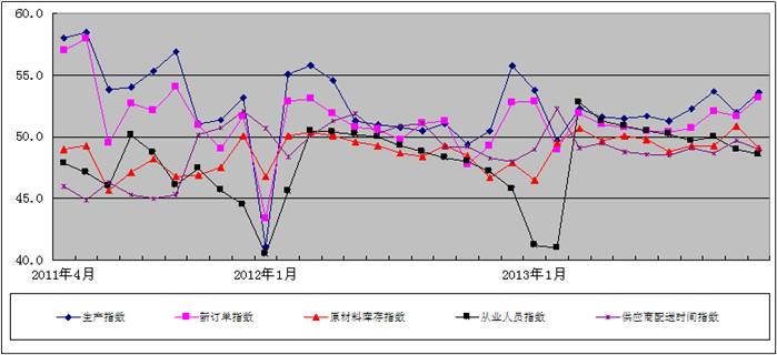 图2 2011年4月-2013年11月广东省重点企业PMI分项指数趋势图