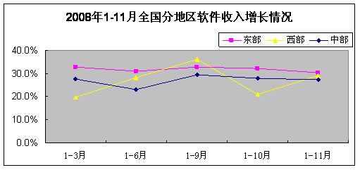 1-11月,东部地区累计完成软件业务收入5987.9亿元,占全国软件业务收入的85.8%,同比增长30.3%,增速比1-10月低1.9个百分点,其中广东、江苏、福建、辽宁等省市增速超过30%;西部地区累计完成软件业务收入539.1亿元,同比增长29.1%,增速低于东部地区1.2个百分点,但高于1-10月8.1个百分点;中部地区累计完成软件业务收入450.3亿元,同比增长27.3%,低于1-10月增速0.6个百分点。