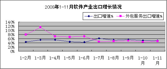 1-11月,我国软件出口125亿美元,同比增长50.3%,增幅比收入高19.5个百分点。软件外包服务出口增速呈下降趋势,1-11月完成出口11.3亿美元,同比增长48.1%,增速比三季度下降2.1个百分点。