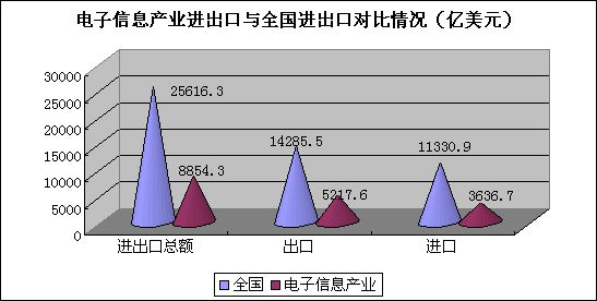 (三)外贸出口进一步攀升。电子信息产品进出口8854亿美元,占全国外贸总额的35%。其中,出口5218亿美元,增长13.6%,占全国出口的36.5%;进口3637亿美元,增长5.4%,占全国进口的32.1%。通信、计算机、家用视听产品仍是出口主要力量,比重接近3/4;加工贸易比重超过80%,但增速同比出现下降。