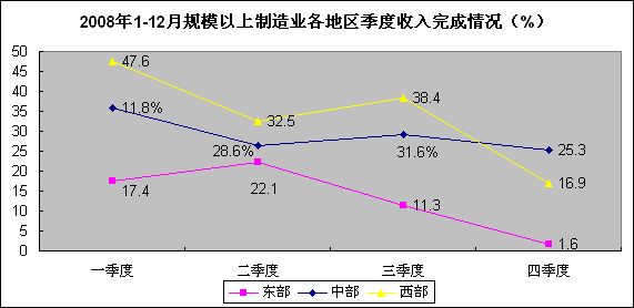 (三)区域发展出现不同格局。一方面,东部地区收入增长慢于中西部地区,东部地区规模以上制造业全年增长11.8%,分别低于中部(28.6%)和西部地区(31.6%)16.8和19.8个百分点。另一方面,东部地区增速下滑快于中西部地区,相比上半年,东部地区收入增速下降了7.8个百分点,但中西部地区分别下降2、1.2个百分点。北京、天津受奥运等多重因素影响,收入分别下降9.4%和10.5%;四川地震灾区生产恢复迅速,收入增速高达35%。