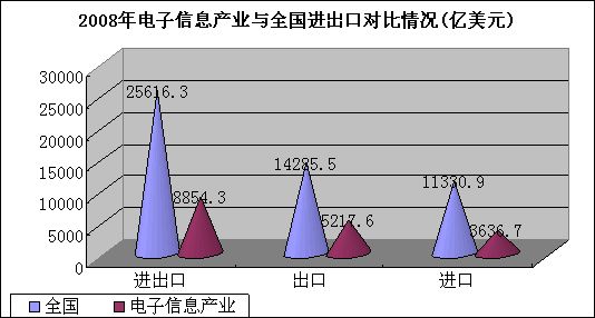 2008年,我国电子信息产品进出口贸易总体保持平稳增长态势,但下半年受国际金融危机影响,增幅较上年同期明显回落。全年进出口总额8854.3亿美元,同比增长10%,增速比上年同期下降13.4个百分点,低于全国商品进出口增幅7.8个百分点,占全国外贸总额的34.6%,比上年下降2.4个百分点。