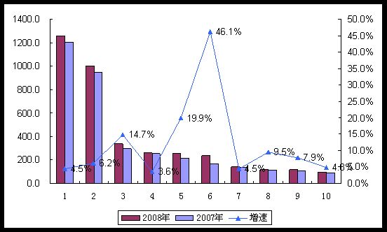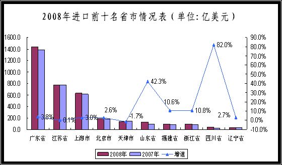 图5 2008年进口前十名地区和国家情况表(单位:亿美元)