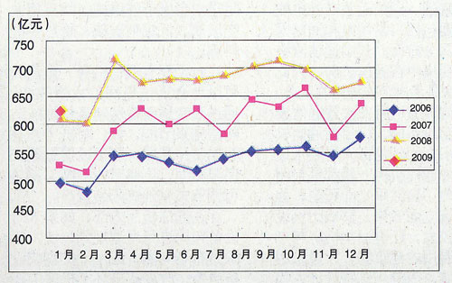 图1.2006~2009年各月电信业务收入比较