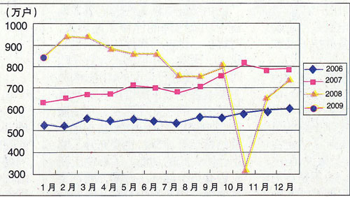 图3.2006~2009年移动电话用户各月净增比较