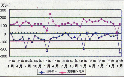 3.互联网用户:基础电信企业的互联网用户进一步趋向宽带化。2009年1月,互联网拨号用户减少253.3万户,达到1184.4万户,而互联网宽带接入用户净增120.6万户,达到8463.1万户。