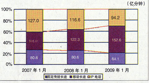 2009年1月,长途电话通话总时长达到310.9亿分钟,比上年同期下降13.5%。其中固定传统长途、IP电话通话时长分别下降20.4%、19.2%,而移动长途电话通话时长增长24.7%。