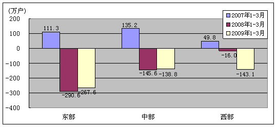 图9. 2007-2009年同期东、中、西部净增固定电话用户