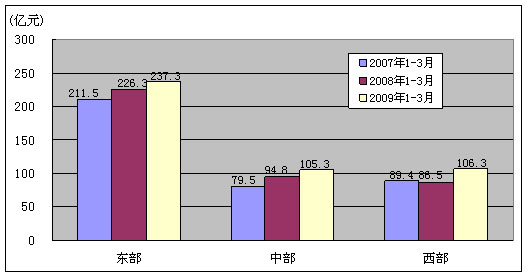 2009年1-3月,中、西部地区电信固定资产投资比上年同期分别增长11.0%、23.0%,明显高于东部地区的4.8%。