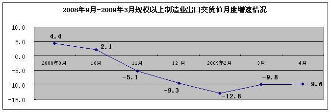 三、主要行业生产增速继续小幅回暖。随着家电下乡等扩大内需政策效应逐步显现,1-4月我国计算机、家用视听行业销售产值增速比1-3月分别回升1.5和4.7个百分点。电子元器件行业继续小幅回调。1-4月,电子器件、电子元件行业销售产值增速分别比1-3月分别回升3.5和3.8个百分点;出口交货值增幅分别回升3.8和3.2个百分点。