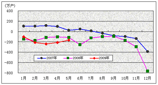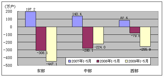 图9. 2007-2009年同期东、中、西部净增固定电话用户