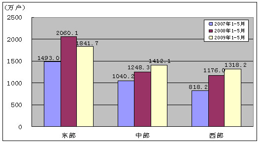 图10. 2007-2009年同期东、中、西部净增移动电话用户