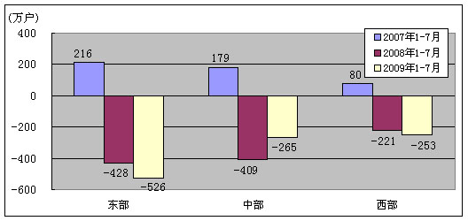 图9. 2007-2009年同期东、中、西部净增固定电话用户