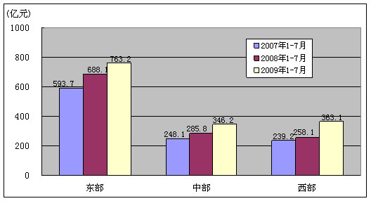 图10. 2007-2009年同期东、中、西部净增移动电话用户