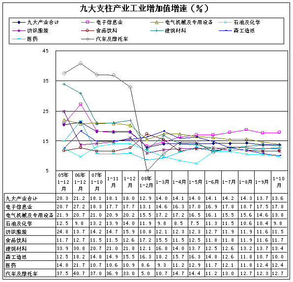 部分大类工业行业增速出现下降。6月起,部分行业当月增速呈现下降趋势。10月当月,37个大类工业行业中,15个行业增速低于10%,5个行业负增长,32个行业增速比去年同月下降,其中,电子信息、石化、电器机械、设备制造、建材、钢铁等行业增速明显趋缓。