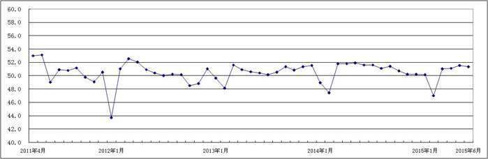 图1 2011年4月-2015年6月广东省重点企业PMI趋势图