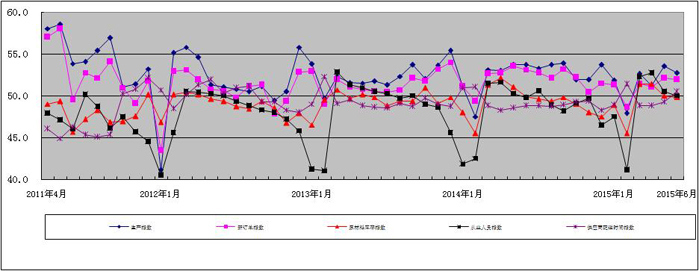 图2 2011年4月-2015年6月广东省重点企业PMI分项指数趋势图