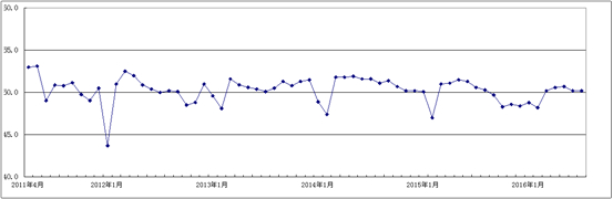 图1 2011年4月-2016年7月广东省重点企业PMI趋势图