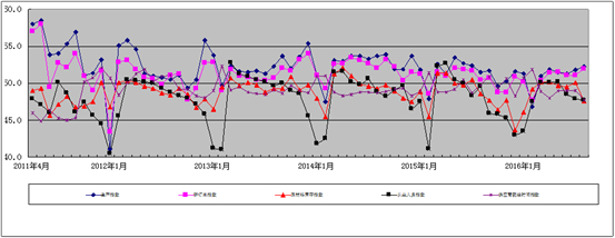 图2 2011年4月-2016年8月广东省重点企业PMI分项指数趋势图