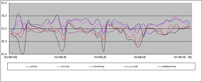 图2 2012年10月-2017年4月广东省重点企业PMI分项指数趋势图