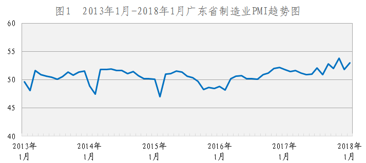 2018年1月,广东省制造业采购经理指数(PMI)为53.0,较上月上升1.2个百分点(见图1)。从国际大环境看,2017年下半年以来全球制造业发展势头良好,全球PMI指数半年来持续攀升,去年12月全球PMI指数(摩根大通发布)为54.5;主要制造业大国PMI指数均居于本区域相对高位运行,如美国PMI指数(ISM发布)为59.7,日本PMI指数(Nikkei发布)为54.0,欧元区PMI指数(Markit发布)为60.6。从国内环境看,2017年由国家统计局发布的制造业PMI指数基本保持在51.0-52.0,运行态势平稳。综合外部市场转暖和内部大环境趋稳,我省工业经济运行基础扎实、稳中有进。但考虑人民币短期迅速升值和美国特朗普政府颁布新税改政策影响,应警惕短期下行风险。具体情况如下:
