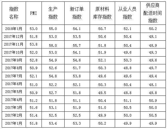 表 2017年1月-2018年1月广东省制造业PMI主要分项指数值表