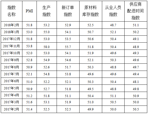 2018年2月,广东省制造业采购经理指数(PMI)为51.8(见表1),较去年同期高0.4个百分点,已连续24个月居于荣枯线上。