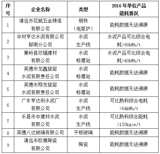 根据国家十六部门《关于利用综合标准依法依规推动落后产能退出的指导意见》(工信部联产业﹝2017﹞30号)、《广东省经济和信息化委等五部门转发关于利用综合标准依法依规推动落后产能退出的指导意见的通知》(粤经信产业函〔2017〕133号)要求,我委对全省30家钢铁生产企业、171家水泥生产企业、16家平板玻璃生产企业和10家陶瓷生产企业开展了2016年产品能耗限额现场节能监察,现将2016年单位产品能耗不达标应限期整改的9家企业名单(含能耗数据无法溯源)予以公布。按照工信部联产业〔2017〕30号文件要求,名单内企业应在《限期整改通知书》下发之日起6个月内整改;确需延长整改期限的,可向我委提出不超过3个月的延期申请;逾期未整改或经整改仍未达标的,依法关停退出。