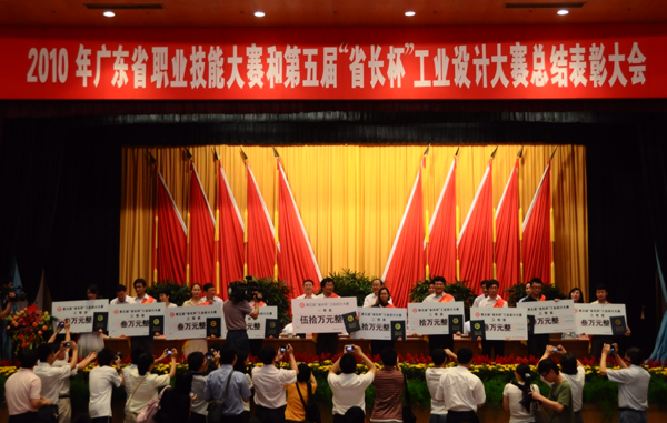6月1日上午,2010年广东省职业技能大赛和第五届“省长杯”工业设计大赛总结表彰大会在省府礼堂隆重举行。省委常委、副省长肖志恒,副省长佟星出席大会并讲话。大会由省政府副秘书长杨绍森主持。省经济和信息化委员会杨建初主任代表大赛主委会宣读了《关于表彰广东省第五届“省长杯”工业设计大赛获奖项目及先进单位和先进个人的通报》。大会为两项大赛的优胜选手以及参与大赛的先进集体和个人颁奖。出席仪式的还有省直有关部门、各市、企业、机构、院校和参赛代表1200多人。