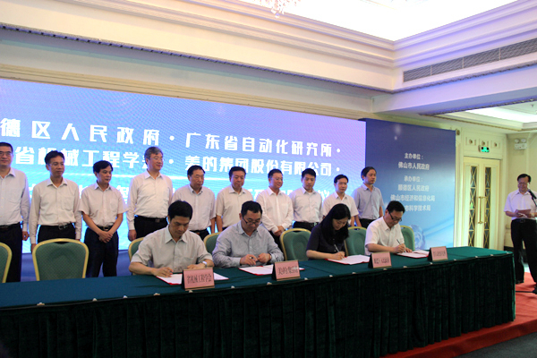 省市有关领导为广东省机器人产业发展示范区、华南智能机器人创新研究院等揭牌。会上还进行了省自动化研究所等四家单位共建华南智能机器人创新研究院、顺德区人民政府与库卡机器人(上海)有限公司签订进驻佛山新城中欧服务中心设立机器人工程中心等一系列合作协议签约。