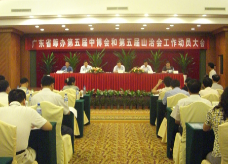 2008年6月25日,广东省筹备第五届中博会和第五届山洽会工作动员大会在湛江召开。“中博会”、“山洽会”组委会和秘书处领导及成员、各市经贸局(经贸委、贸工局、经协办)、中小企业局分管领导及联络员、省属资产经营公司、授权经营集团分管负责人及联络员、有组团任务的省直部门分管领导及联络员,以及第四届中博会受表彰的先进集体代表参加了动员会。动员会上,中博会组委会副秘书长、秘书处主任、省经贸委主任杨建初和中博会组委会秘书处副主任、广东省经贸委副主任陈向新分别作了第五届中博会和第五届山洽会的筹备工作动员讲话。湛江市委常委、副市长赵志辉代表湛江市政府作了致辞。