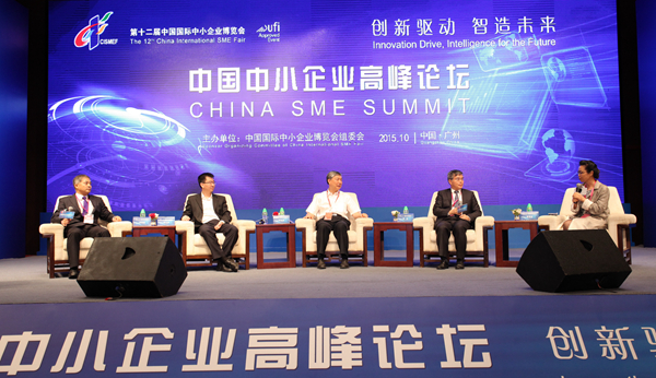 10月10日下午,第十二届中博会中国中小企业高峰论坛(主论坛)在广州花园酒店举行。本届高峰论坛以“创新驱动,智造未来”为主题,积极响应“中国制造2025”战略部署,结合当前中小企业发展的新形势,聚焦中国制造业的创新与转型。中博会组委会副主任兼执行主任、副省长,中博会组委会副主任、工业和信息化部副部长辛国斌以及联合主办国马来西亚代表团代表、马中总商会会长黄汉良出席论坛并致辞。国家工商总局个体私营经济监管司巡视员刘小平,省中小企业局局长姚德洪,联合主办国马来西亚代表团嘉宾、有关国家驻穗总领事馆代表出席论坛。