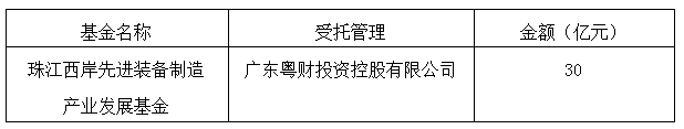 为贯彻落实省委、省政府关于珠江西岸先进装备制造产业带建设工作部署,以省财政资金带动社会资本共同投入珠江西岸先进装备产业带建设,省人民政府决定设立珠江西岸先进装备制造产业发展基金。经省财政厅会省经济和信息化委组织专家论证、公开遴选,并报省领导审定同意,选定由广东粤财投资控股有限公司作为珠江西岸先进装备制造产业发展基金的受托管理机构,2015年拟安排30亿元至该受托管理机构,现予以公示。如有异议,请向省经济和信息化委(珠江西岸办)、省财政厅(工贸处)反映。