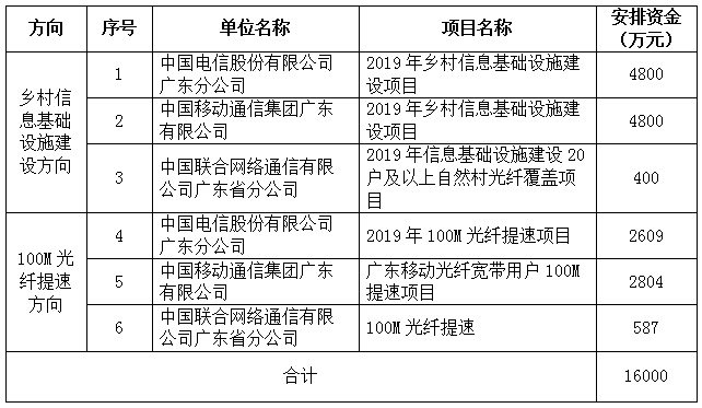 为贯彻落实《广东省信息基础设施建设三年行动计划(2018-2020年)》(粤府办〔2018〕14号),推进百兆光纤进家庭、千兆光纤进小区,以粤东粤西粤北地区为重点推进20户以上自然村连通光缆,我厅于2018年10月16日印发了《快猫 关于开展2019年信息基础设施建设资金申报工作的通知》(粤工信信息函〔2018〕9号),并于2018年11月6日组织专家对申报项目进行评审。根据评审结果拟安排1.6亿元专项资金用于支持2个方向共计6个项目。现将资金安排计划予以公示(见附件)。公示期自2018年12月28日至2019年1月3日,共7天。对公示内容如有异议,请在公示期内向快猫 (信息化推进处)和省财政厅(工贸发展处)反映。以个人名义反映情况的,请提供真实姓名、联系方式和反映事项证明材料等;以单位名义反映情况的,请提供真实单位名称(加盖公章)、联系人、联系方式和反映事项证明材料等。