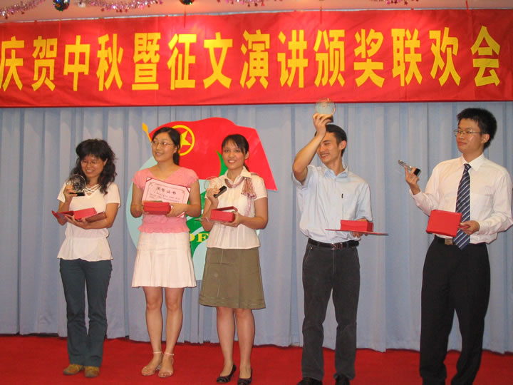 联欢会上揭晓了“知荣辱,促和谐,我与祖国共奋进”主题征文、演讲和联欢会节目等奖项,其中征文特等奖1名,一等奖5名,二等奖10名,三等奖22名,优秀奖45名;演讲特等奖1名,一等奖3名,二等奖3名,三等奖6名,优秀奖5名;最受欢迎节目特等奖1个、一等奖3个、二等奖5个、三等奖6个。各奖项的前三名分别是:技术改造处王婧(征文状元)、法规处谢斌(征文榜眼)、工业处卢振港(征文探花);电子所王晓敏(演讲状元)、法规处谢斌(演讲榜眼)、电子所杜翠娟(演讲探花);委机关支部的原创青春剧《四个女生和四个男生的故事》(最受欢迎节目金奖)、酒类检测中心支部的武术表演《好男儿》(最受欢迎节目银奖)、委中心支部的舞蹈《明天更辉煌》(最受欢迎节目铜奖)。