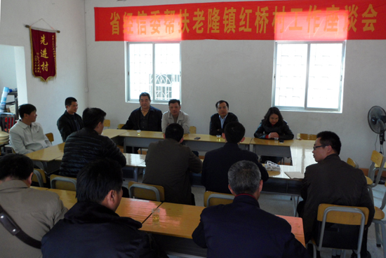 最后,张文献局长一行在村委会和村干部、驻村工作组亲切座谈,认真听取了驻村工作组对我委今年以来的帮扶工作情况介绍和村干部对我委帮扶工作的意见和要求。张文献局长指出,今年以来,我委对口红桥村的扶贫开发“双到”成效显著,基本上完成了我委当时制定的“三年任务两年完成”的既定目标,这与委党组的正确领导,与驻村工作组、村干部的努力付出密不可分。下一步,省中小企业局将大力支持我委对口红桥村的产业扶贫项目,推动我委产业扶贫工作上新台阶。