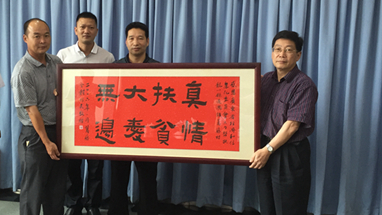 镇、村有关负责人向省经济和信息化委赠送书写“真情扶贫 大爱无边”的牌匾,代表葛藤村全体老百姓,感谢省经济和信息化委第二轮扶贫开发“双到”工作期间对葛藤村的大力帮扶、真情扶贫,曾健代表省经济和信息化委接收了牌匾。