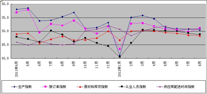 图2 2011年4月-2012年8月广东省重点企业PMI分项指数趋势图