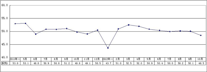 2012年10月,广东省制造业采购经理指数(重点企业PMI)为48.5,较上月回落1.6个百分点,是自今年2月份以来首次跌落到50.0荣枯线之下。