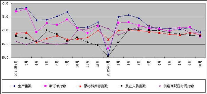 图2 2011年4月-2012年10月广东省重点企业PMI分项指数趋势图