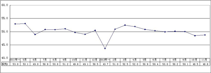 指数 名称 PMI 生产 指数 新订单 指数 原材料 库存指数 从业人员 指数 供应商配送 时间指数 2012年11月 48.8 50.5 49.3 46.7 47.2 48.3 2012年10月 48.5 49.4 47.8 48.5 48.0 49.2 2012年9月 50.1 51.1 51.3 49.3 48.3 49.2 2012年8月 50.2 50.5 51.1 48.4 48.8 51.1 2012年7月 50.0 50.8 49.8 48.7 49.3 50.9 2012年6月 50.4 51.0 50.6 49.3 50.0 50.3 2012年5月 50.9 51.3 50.8 49.6 50.2 51.9 2012年4月 52.0 53.6 52.7 50.1 50.4 51.3 2012年3月 52.5 55.8 53.1 50.4 50.5 50.1 2012年2月 51.0 55.1 52.9 50.1 45.6 48.4 2012年1月 43.7 41.1 43.4 46.8 40.5 50.7 2011年12月 50.5 53.2 51.7 50.1 44.5 52.1