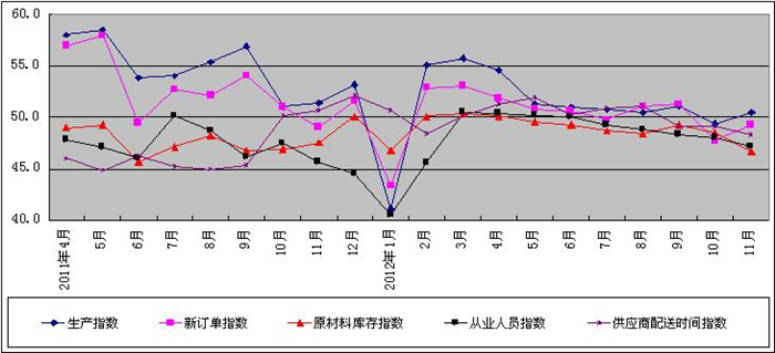 图2 2011年4月-2012年11月广东省重点企业PMI分项指数趋势图