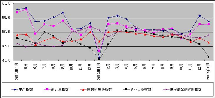 图2 2011年4月-2013年1月广东省重点企业PMI分项指数趋势图