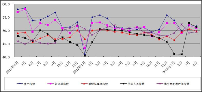 图2 2011年4月-2013年4月广东省重点企业PMI分项指数趋势图