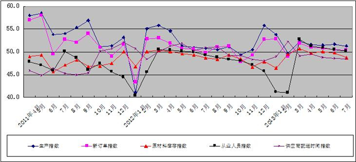 图2 2011年4月-2013年7月广东省重点企业PMI分项指数趋势图