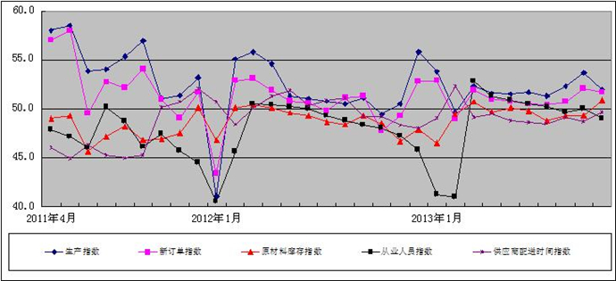 图2 2011年4月-2013年10月广东省重点企业PMI分项指数趋势图