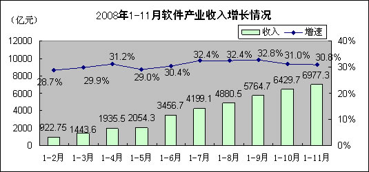 1-11月,软件产业继续保持快速增长的态势,累计完成软件业务收入6977.3亿元,同比增长30.8%,增速比去年同期高10.8个百分点,但比三季度低2个百分点。